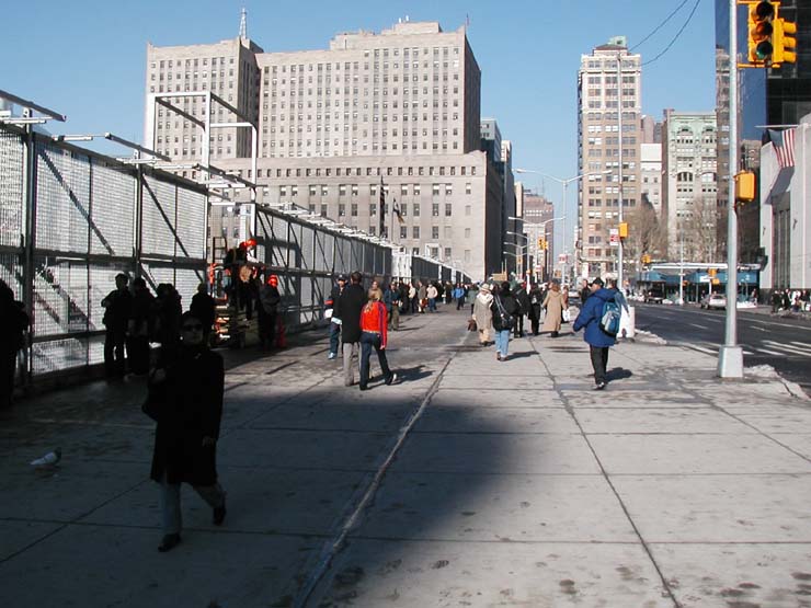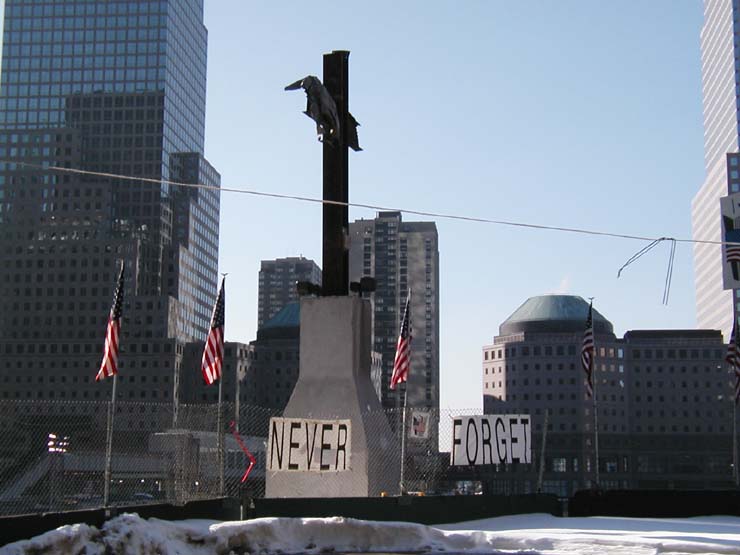 グラウンド・ゼロにはたくさんの人が訪れていた。つい先日、見学サイトがまた閉められて、フェンスが現場より10メートルくらいバックしていたが、現場は十分にみることができた。実際の貿易センターをみたことがないので、ここに110階建てのツインタワーが聳えていたということは想像がつかない。しかし現実に、ここにあったビルに2年前の9月11日にテロによって破壊され、同時に数千人の人が亡くなったのだ。見学サイトには、WTCの歴史として、WTC建設前の写真、建設中の写真、オープンの写真がかけられていた。当時、テロによってこのビルが破壊されようとは、だれも想像していなかったに違いない。いや、テロの前日までそんなことを考えていた人はいなかったはずだ。瓦礫の鉄骨の一部で造られたという十字架が、ここで起こった出来事の象徴となっている。