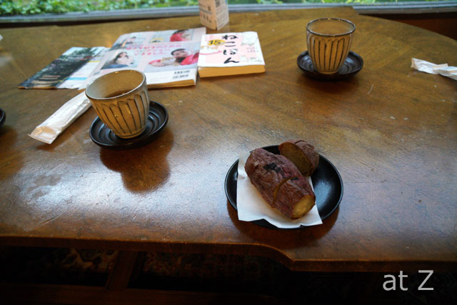 館内はスリッパに履き替えるタイプ。ロビーのソファーにご案内をいただき、そこでウェルカムドリンクと焼き芋をいただきながらチェックイン。大きな窓からは旭川が眺められる。