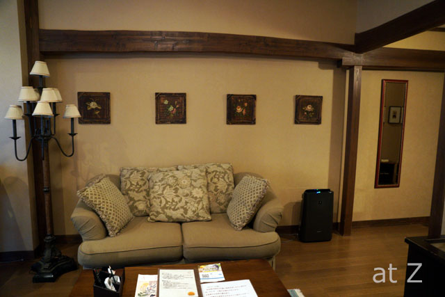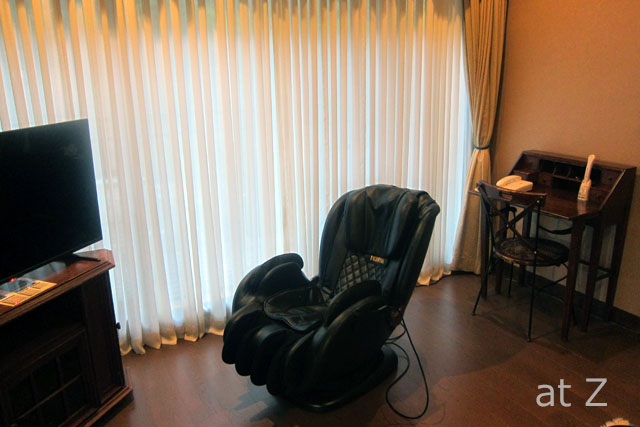 ノスタルジースイートということで、備品はシックな感じ。ただ、高級っぽいマッサージチェアとメディアプレイヤーが備えられていてなかなか良い。マッサージチェアは使いまくった。空気清浄機もあり。山奥なので空気の質は良いと思うが、花粉の時期とか乾燥する時期とかはやはり必須か。