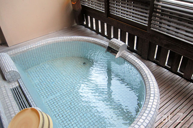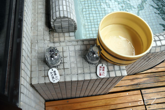 まず、お部屋の露天風呂。こちらは源泉かけ流し。蛇口も、源泉沸かし湯と源泉そのままの2種類があり、好きな温度に調整することができる。
