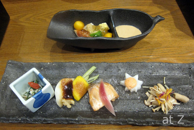 先付  秋の吹き寄せ胡麻クリーム 栗 柿 無花果 焼茄子 梅貝 オクラ