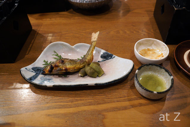 夕食は1階のレストランで。オープンキッチンで鮎の塩焼きを焼いているところを見ながら入場。